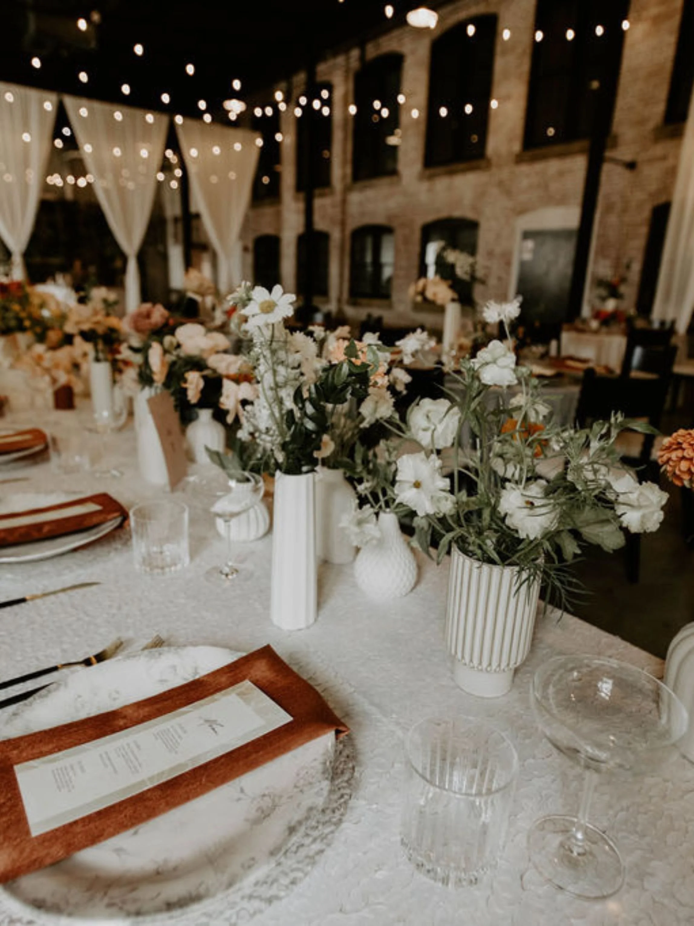 Luxury Linens: Plush velvet table linens, silk runners, or tailored chair cushions that provide a rich opposition to the brick and concrete.