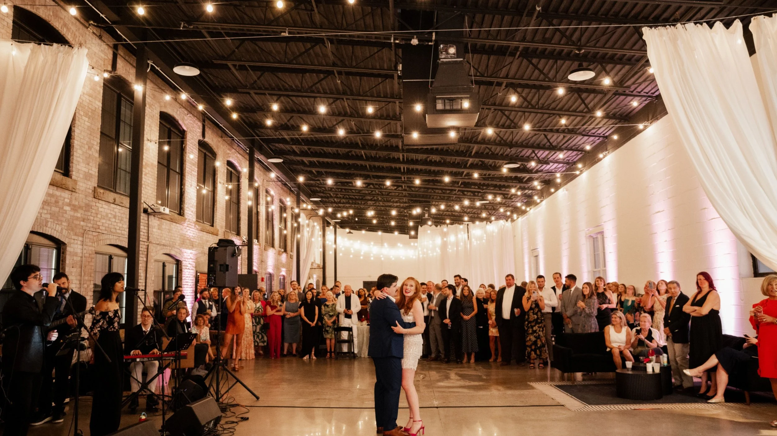 Golden Glow: String lights (bistro lights) strung above the dance floor and key zones for a warm, festive illumination.
