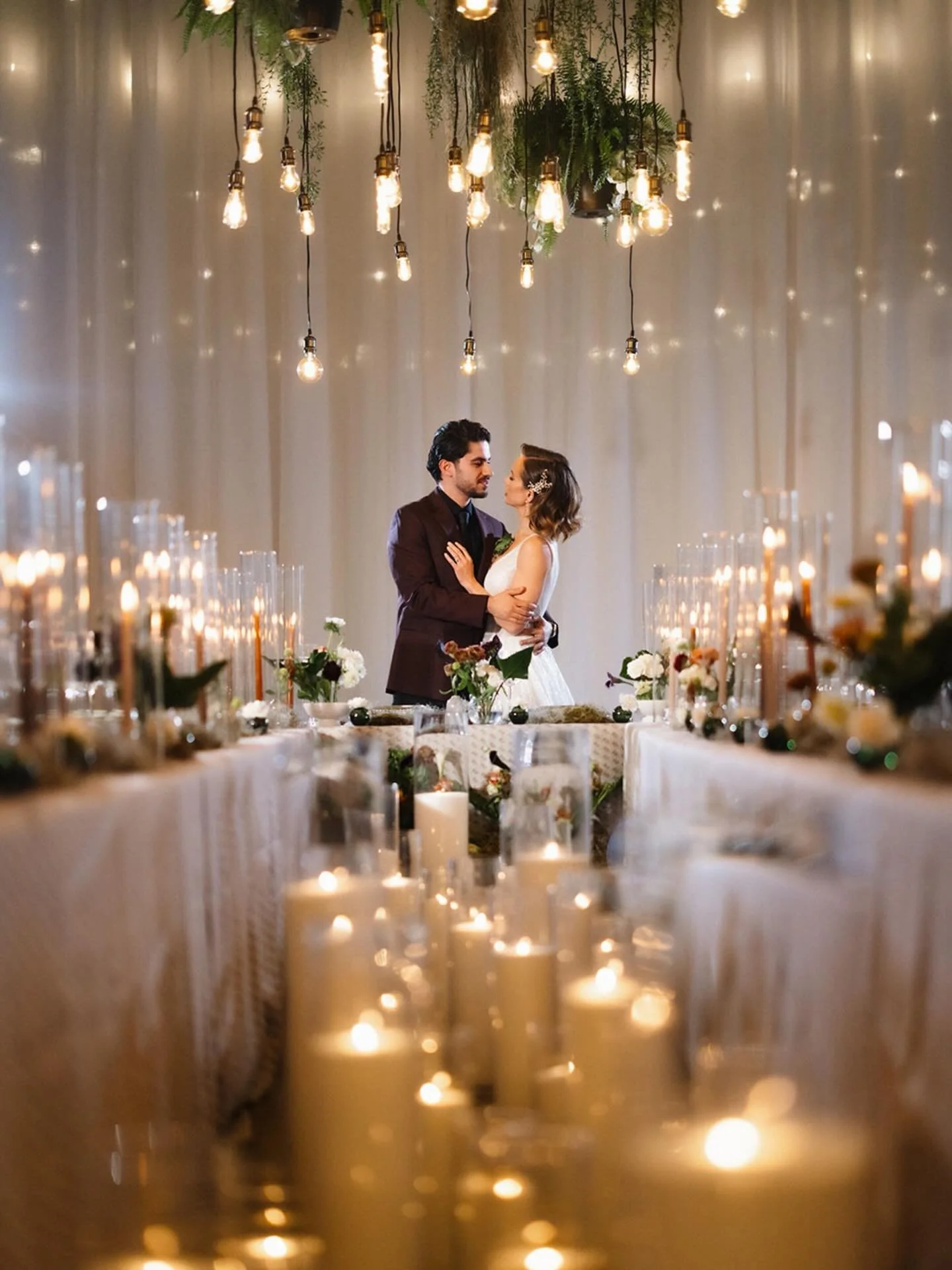 Say your vows beneath glowing bistro lights in a space that feels intentional, intimate, and effortlessly beautiful. Choose from settings framed by soft white drapery, textured brick, an artist-designed backdrop or in front of a plant wall.